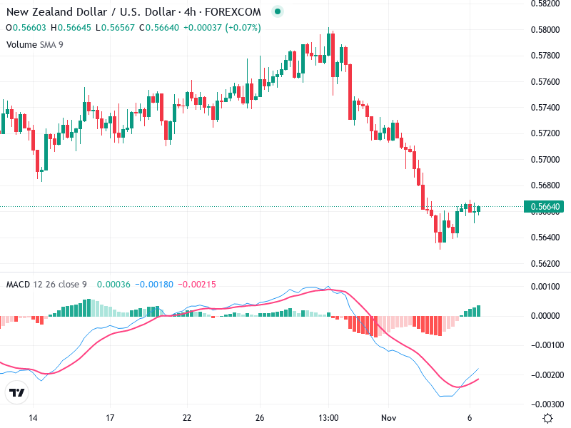 If MACD fails to cross bullishly or price breaks support at 0.56200, it may trigger further downside moves.