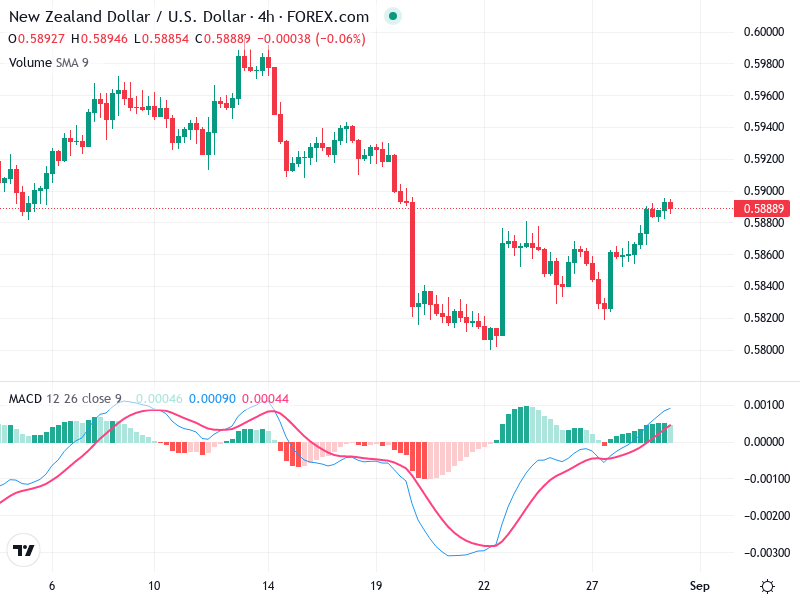 The NZD/USD 4-hour chart suggests potential bullish momentum after a significant rally characterized by bullish formations.