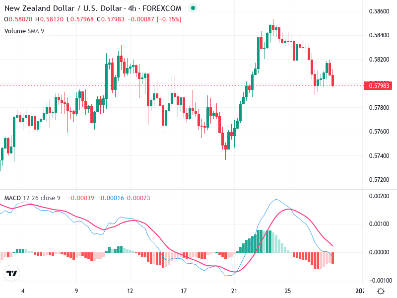 The NZD/USD 4-hour chart shows a generally bullish trend with recent indications of consolidation. Key levels at 0.57800 and 0.58200 are crucial for potential breakout and support zones.