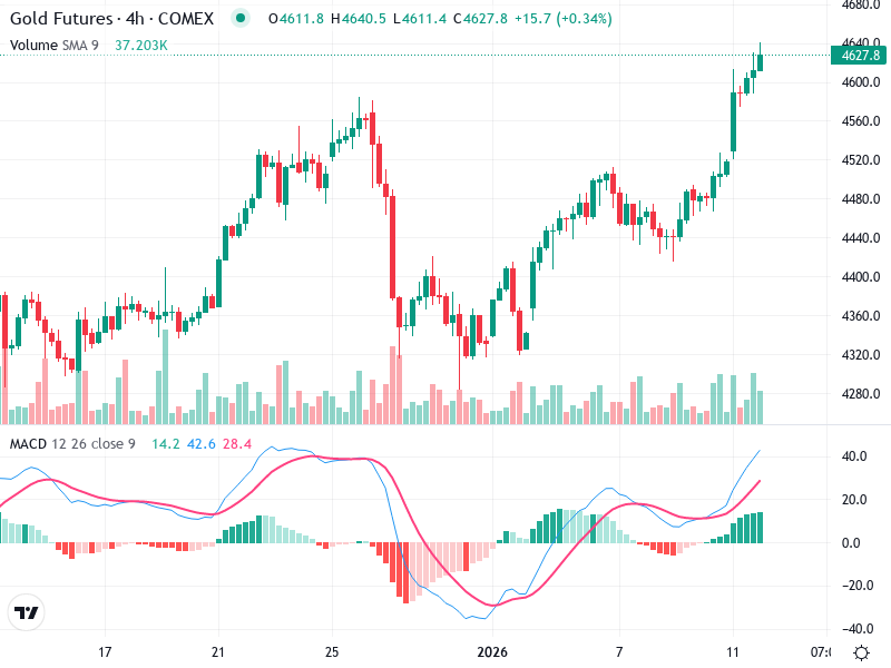 The MACD histogram displays increasing bearish momentum, marked by downward-extending bars, which suggests continuity in the trend unless a reversal emerges.
