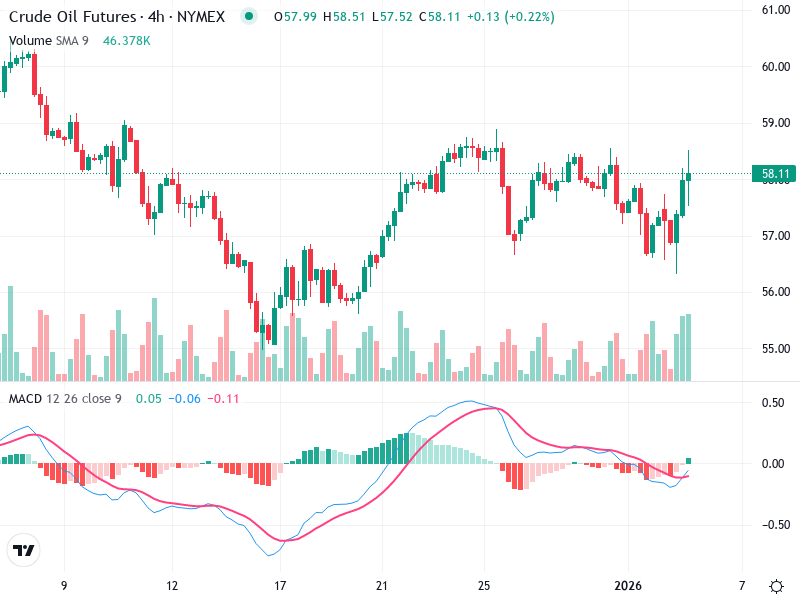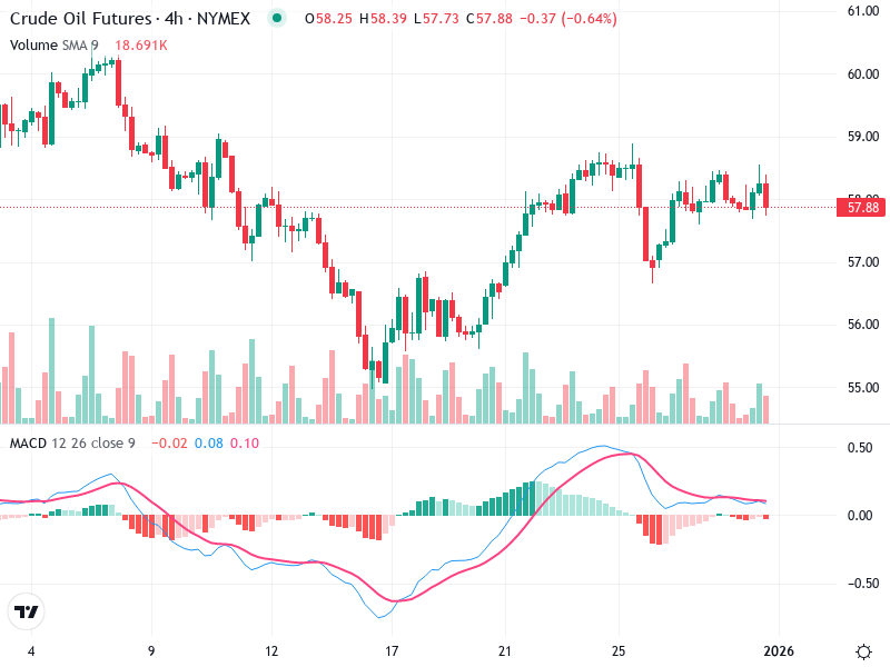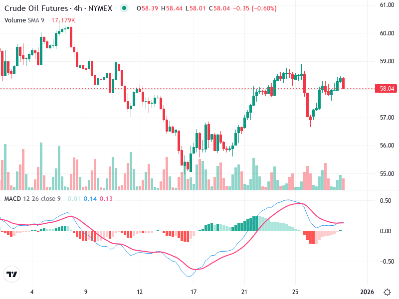 The chart for Crude Oil Futures indicates a cautious market sentiment amid fluctuating price actions. Over