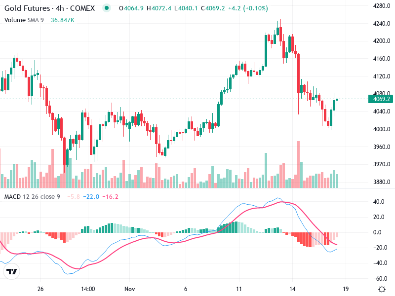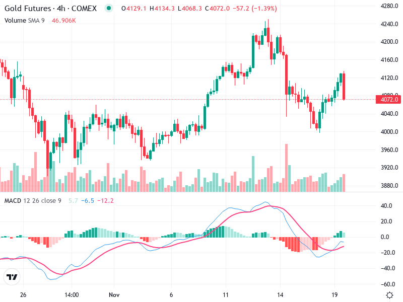 The Gold Futures chart reveals a recent bullish trend that peaked around the 4175 level before