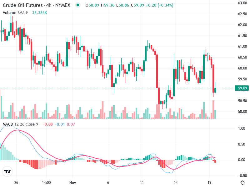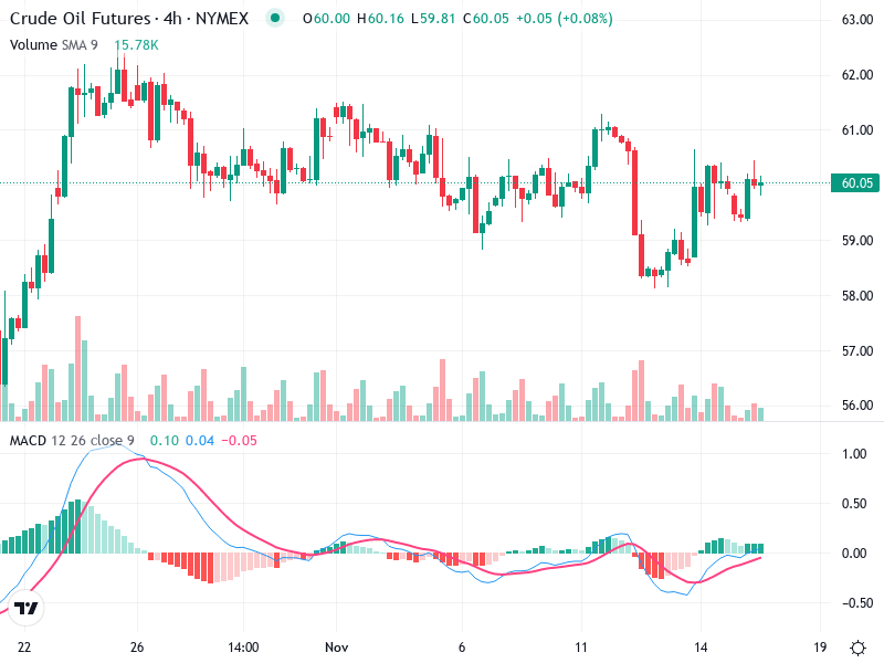 The Crude Oil Futures chart shows a sideways trading pattern between $58.50 and $61.00, indicating market