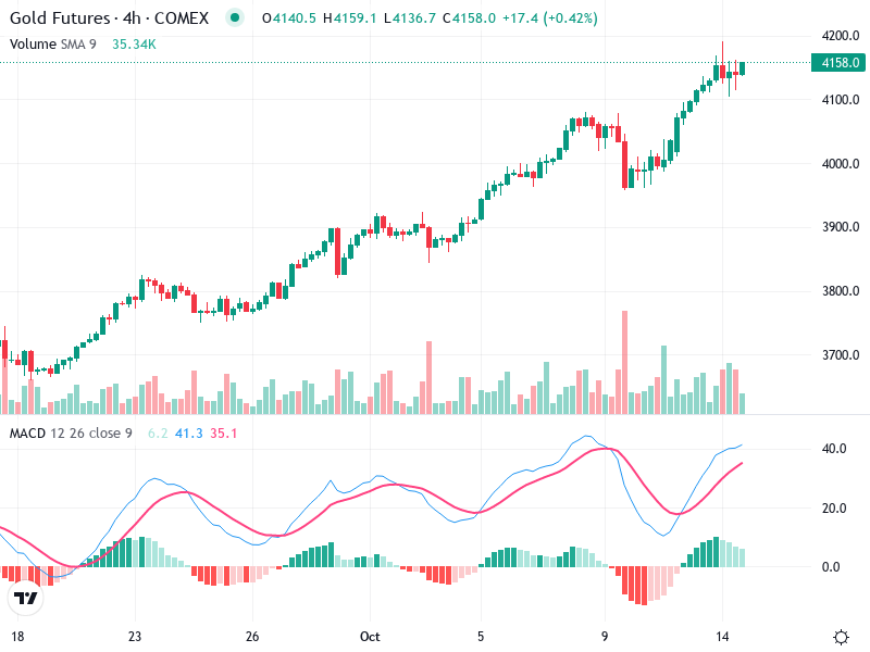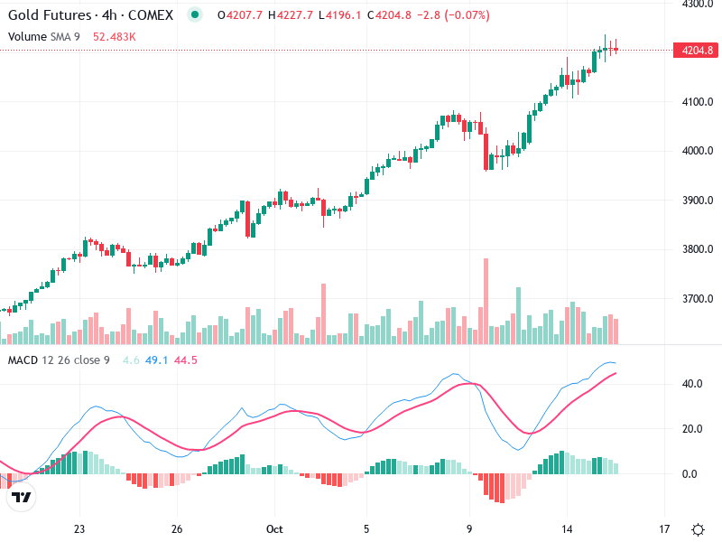 The Gold Futures chart exhibits strong bullish characteristics. The asset is displaying upward momentum, supported by
