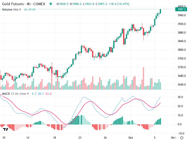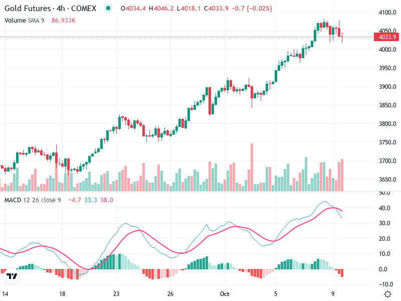 The Gold Futures 4-hour chart shows a solid uptrend. The recent market action indicates a continuation