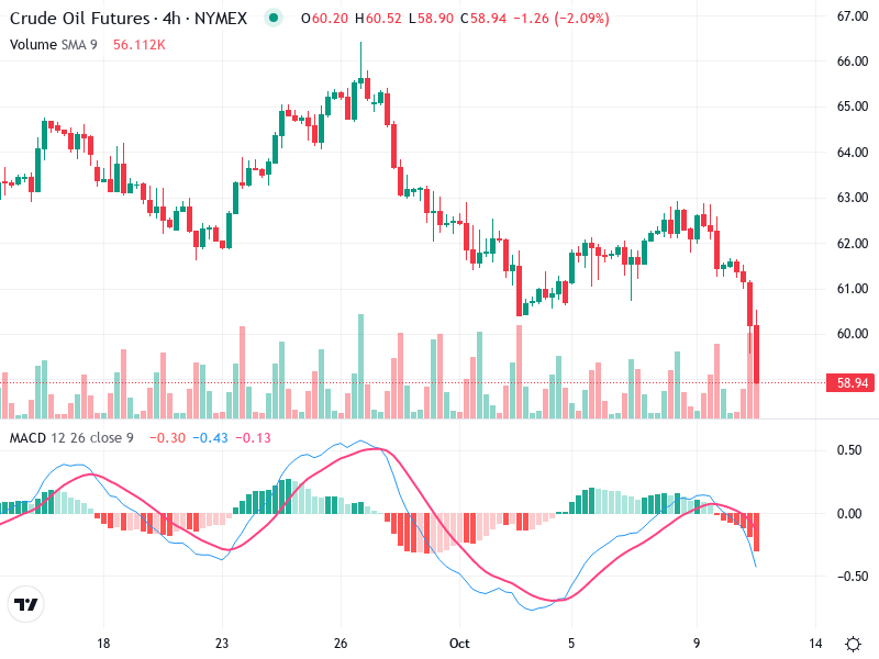 The Crude Oil chart portrays a strong bearish sentiment with consistent bearish candlestick formations. Technical indicators