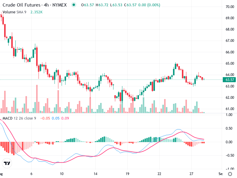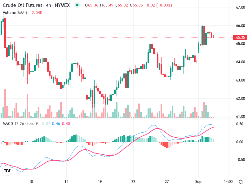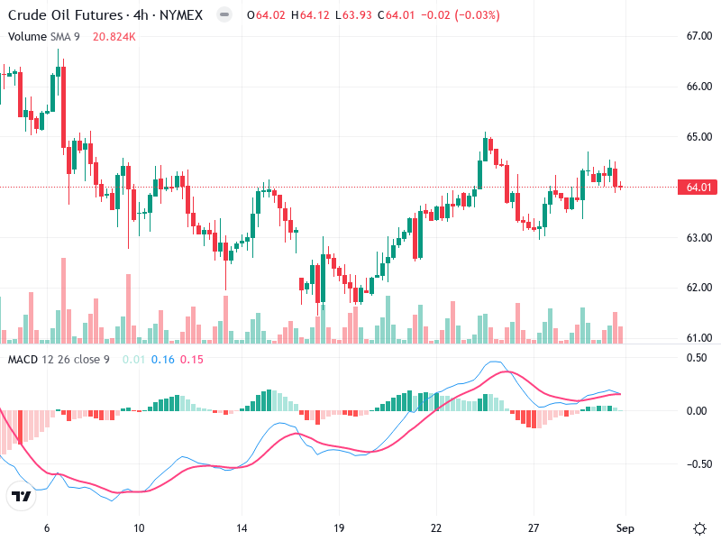 The Crude Oil Futures chart, on a 4-hour timeframe, shows a recent consolidation phase following a