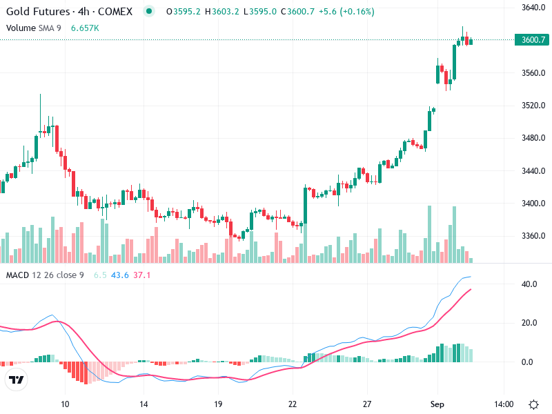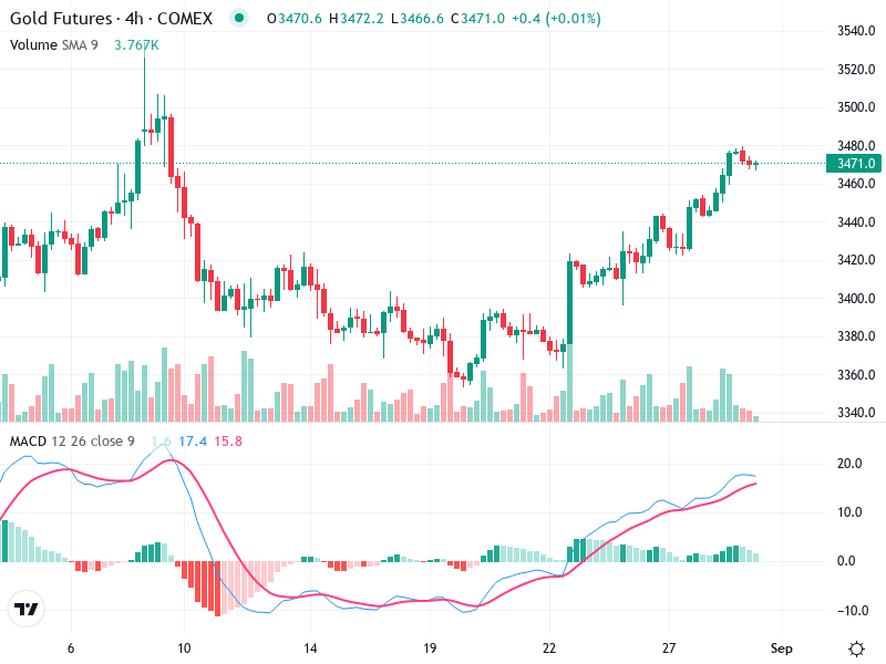 The Gold Futures chart on a 4-hour timeframe shows a strong and consistent bullish trend. Recent