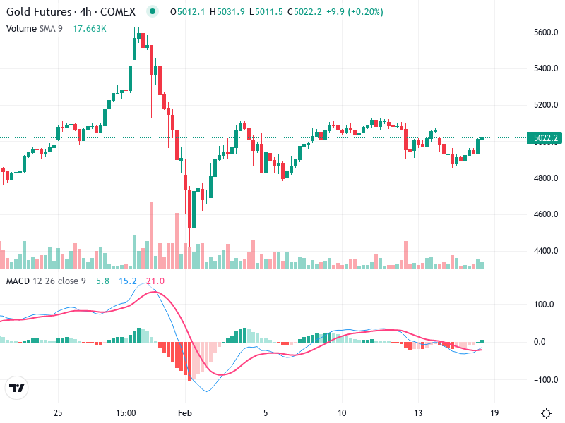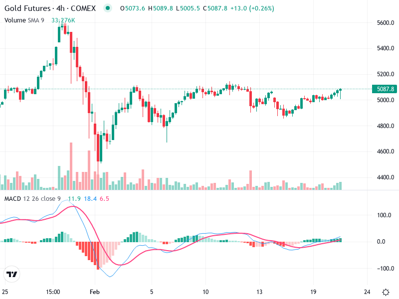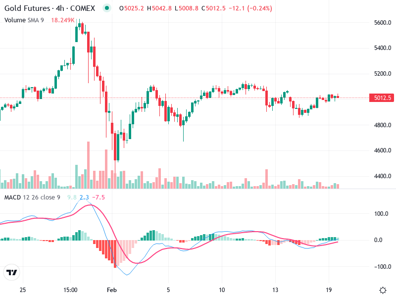 The gold futures chart shows mixed signals with periodic bullish rallies followed by bearish corrections, creating