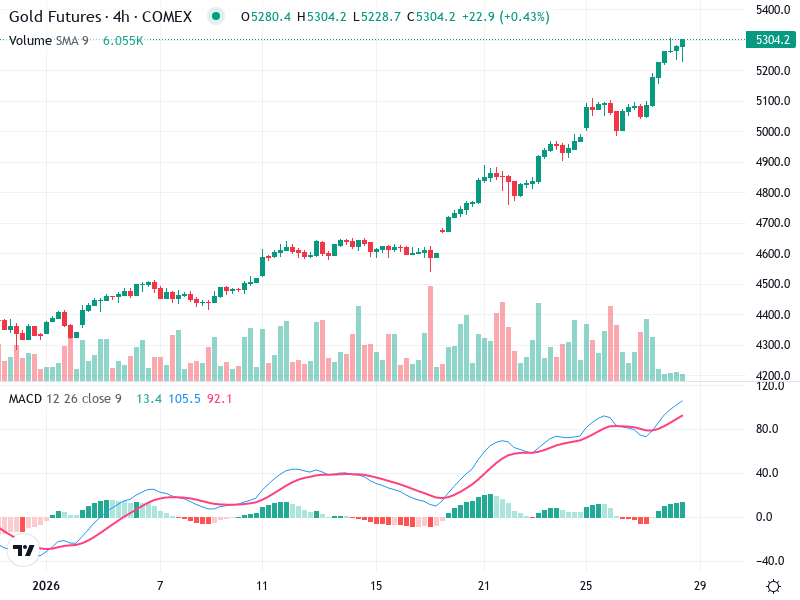 The 4-hour chart of Gold Futures displays a strong bullish trend. Consistent bullish signals have been