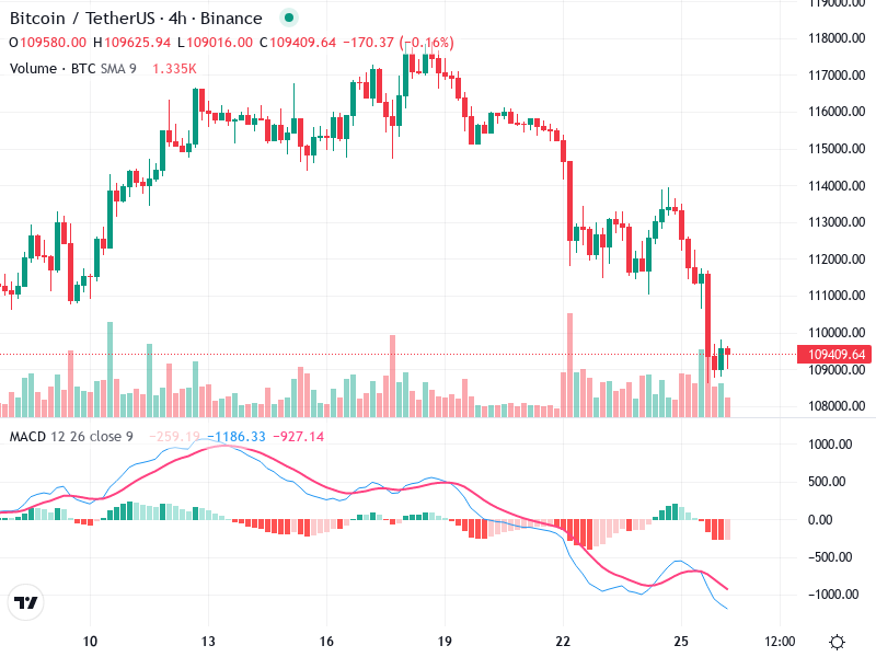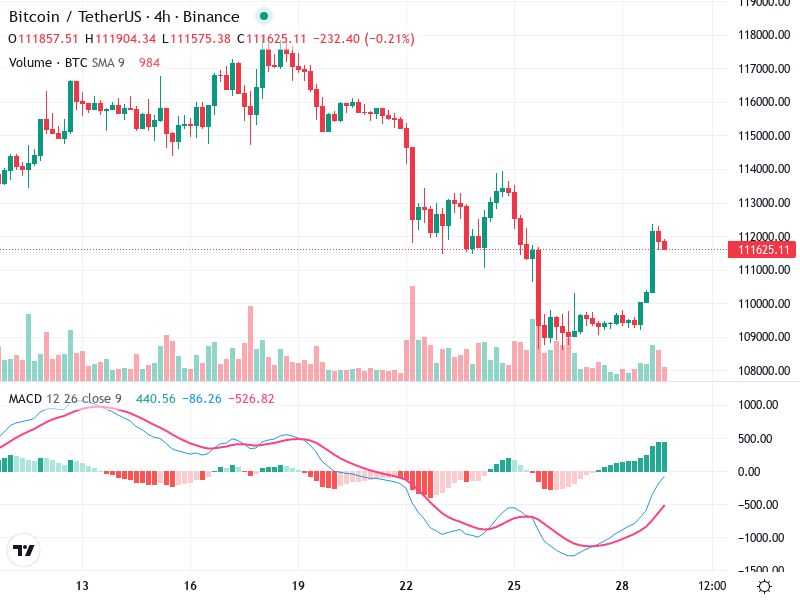 The 4-hour chart for Bitcoin/TetherUS shows a transition in trend dynamics. A notable pattern shift suggests