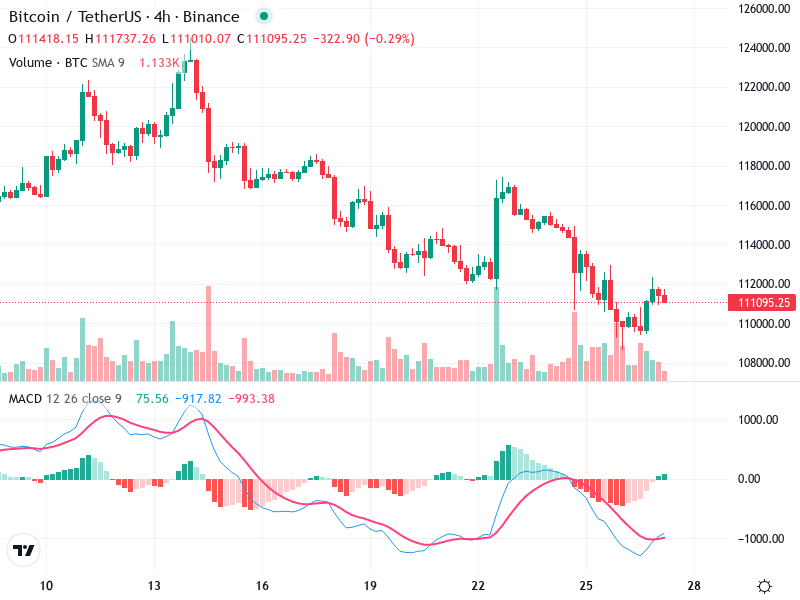The Bitcoin/TetherUS 4-hour chart showcases a period of market indecision with the price oscillating within a