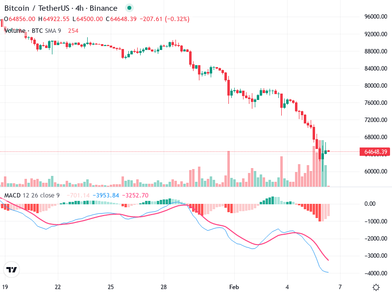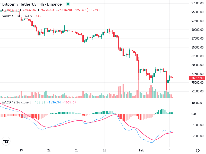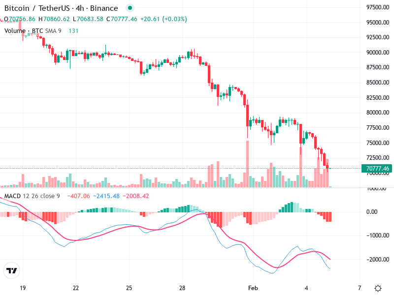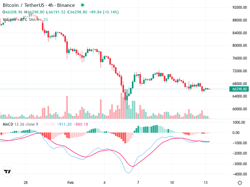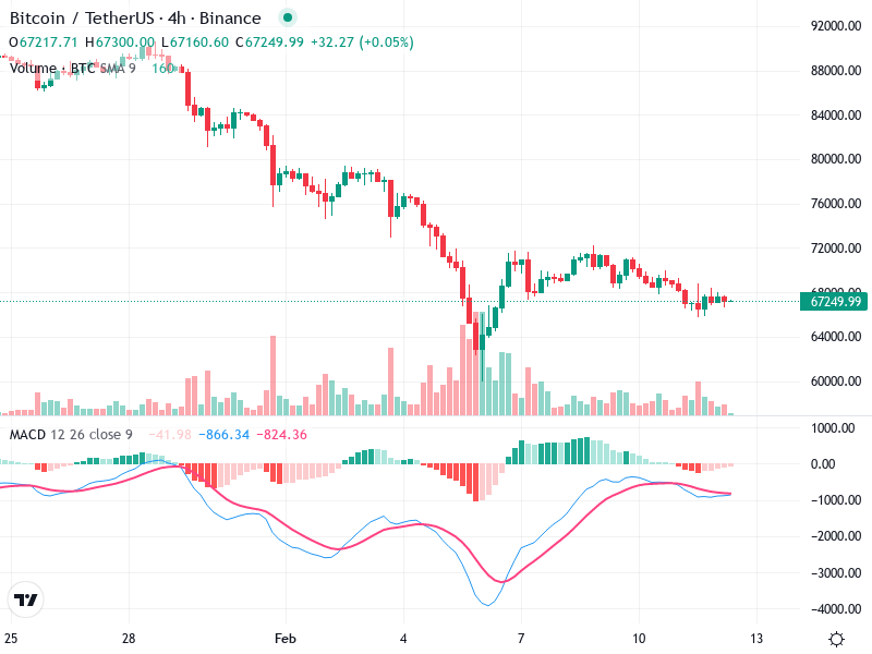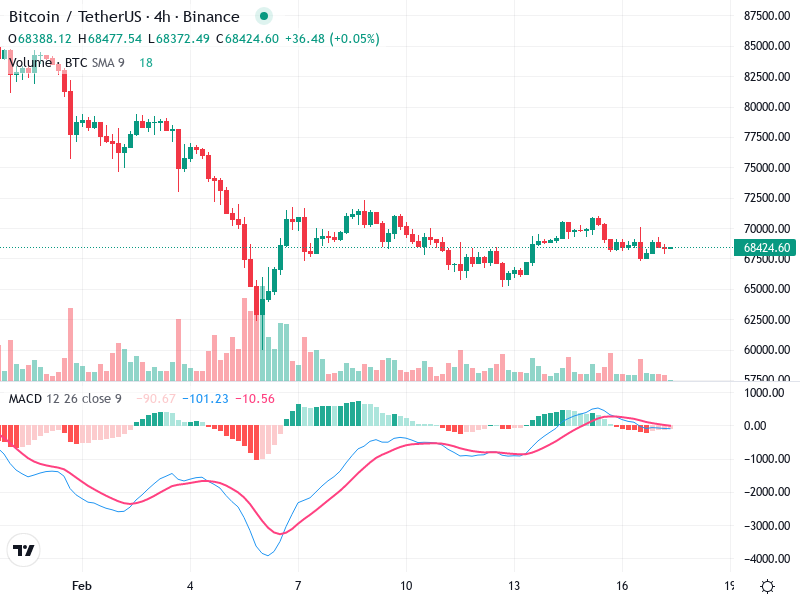 The Bitcoin/TetherUS chart on a 4-hour timeframe shows significant consolidation. The market is in a neutral