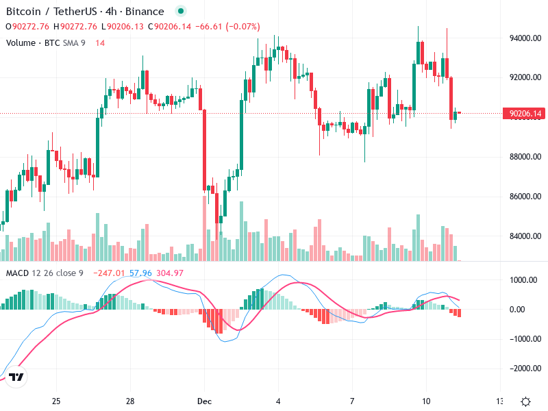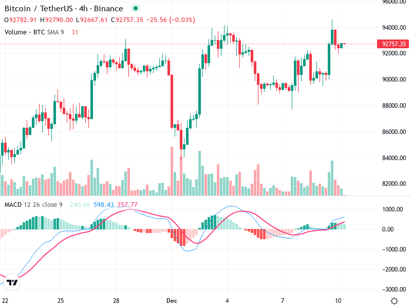 The 4-hour chart for Bitcoin/TetherUS shows recent trends and potential reversal signals. With important technical indicators
