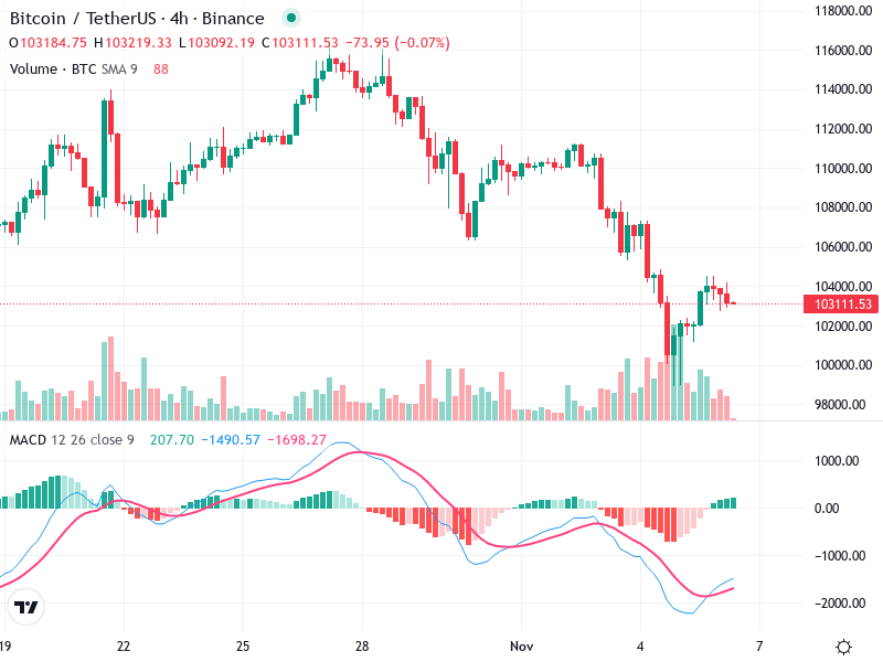 The BTC/USDT 4-hour chart highlights recent market behavior with a cautious outlook. Recent analysis indicates a