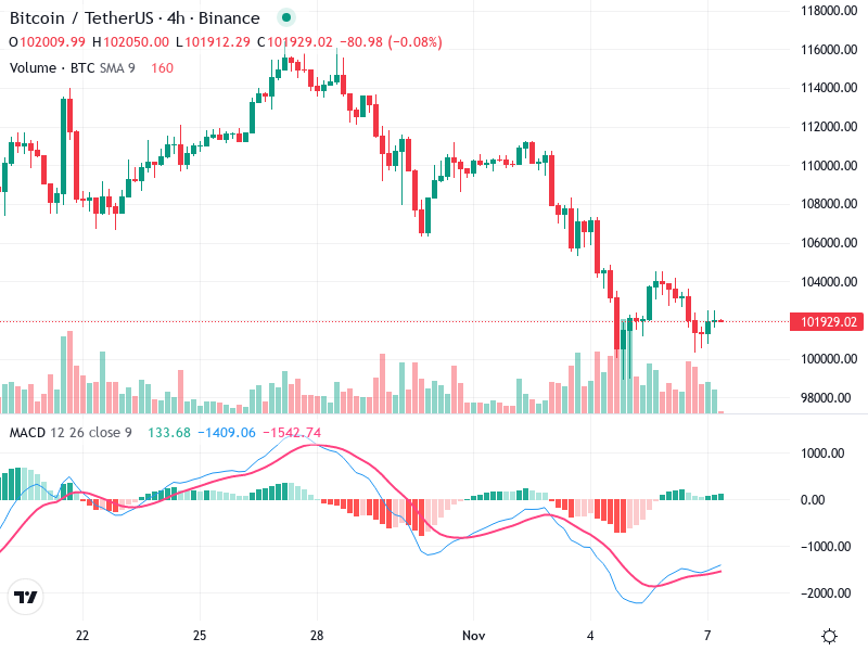 The 4-hour chart for Bitcoin/TetherUS reveals a bearish trend with lower highs and lows. The presence