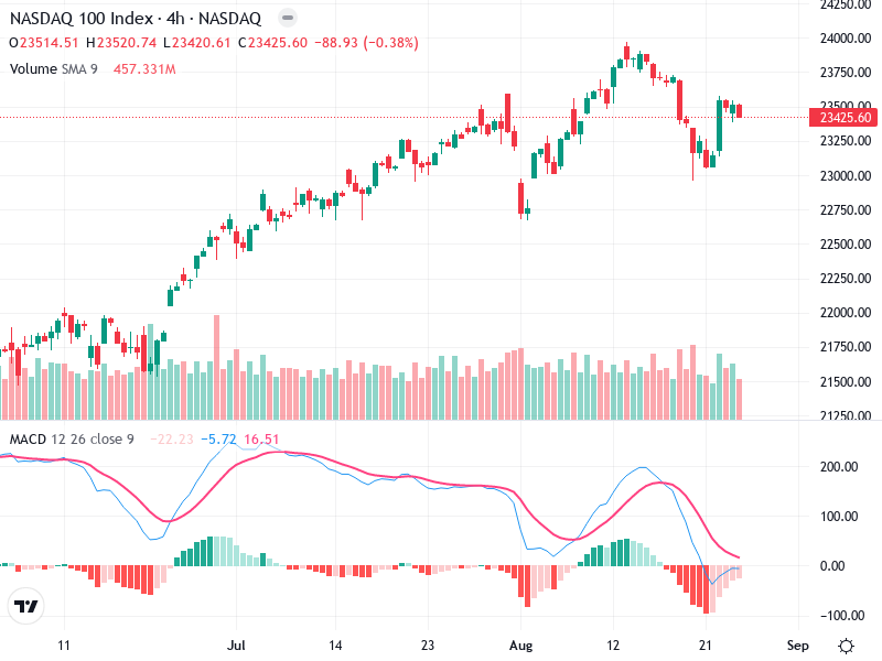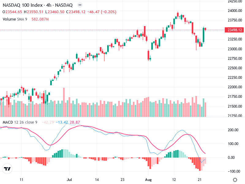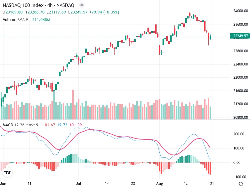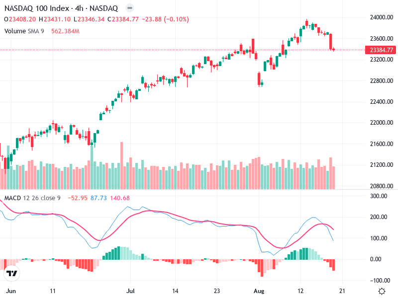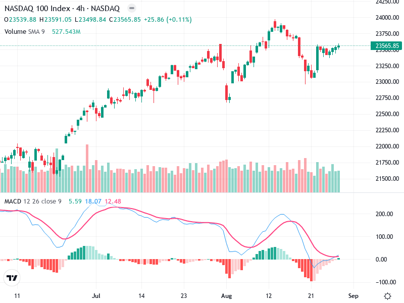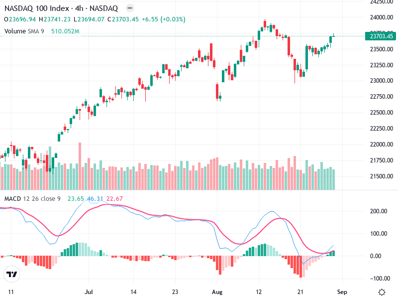 The chart of NASDAQ 100 Index reveals an ongoing uptrend dating back to mid-July, indicating a