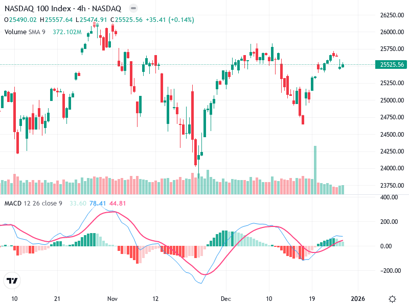 The NASDAQ 100 Index shows significant movement as it recovers from a recent pullback. The chart