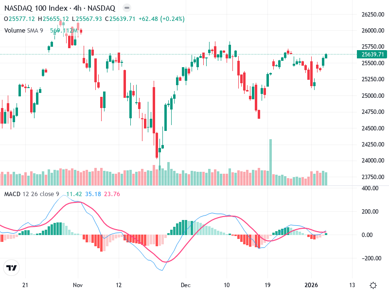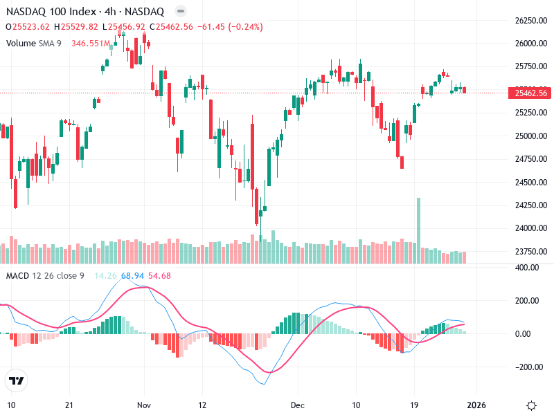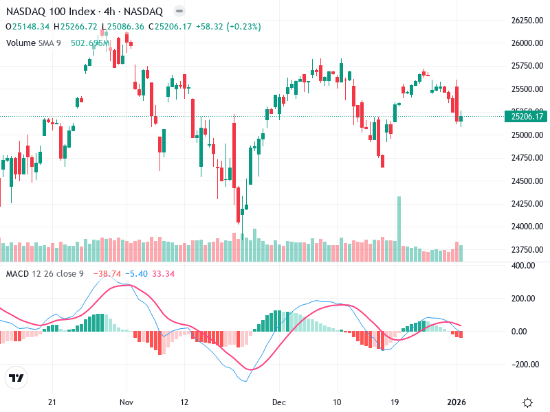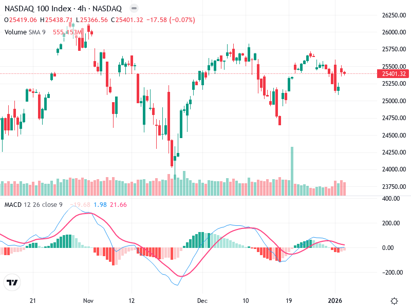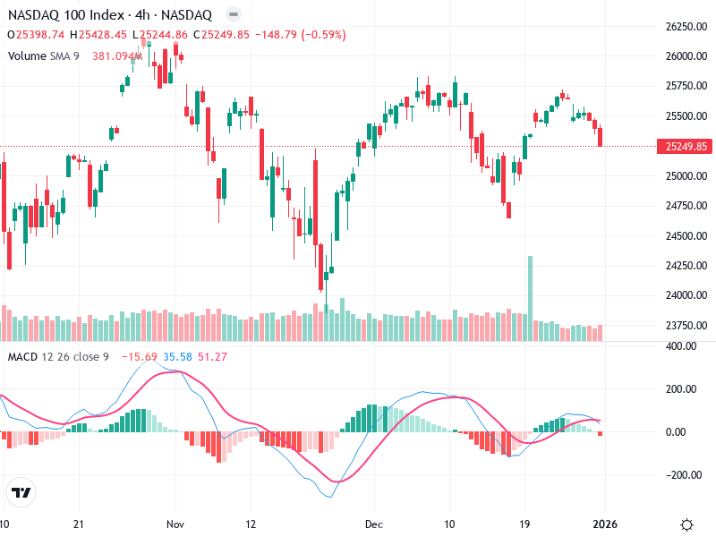 The NASDAQ 100 Index is exhibiting a bearish trend on the 4-hour chart, with increasing selling